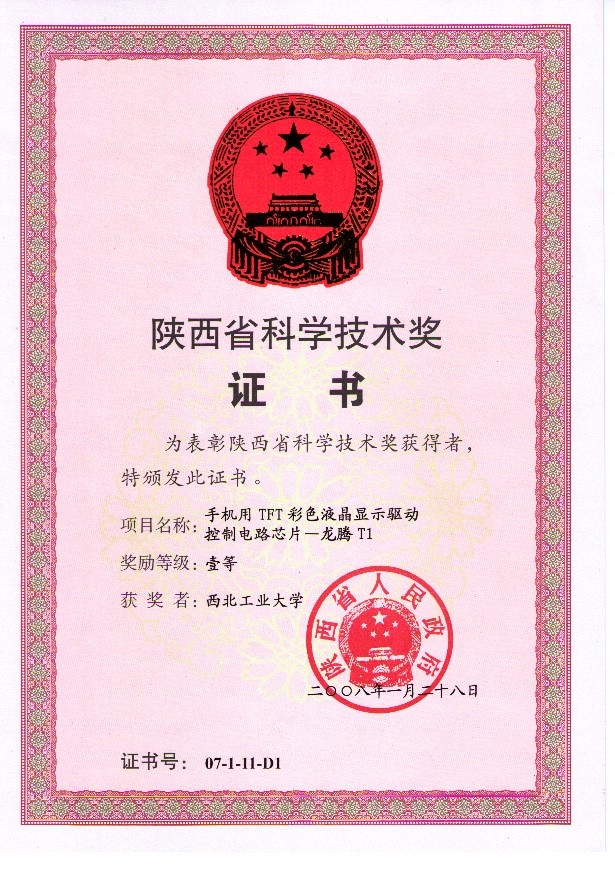 1) “手机用TFT彩色液晶显示驱动控制电路芯片—龙腾T1”,获得2007年度陕西省科学技术一等奖。(第一完成人)