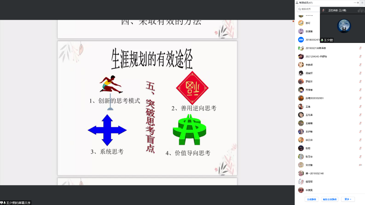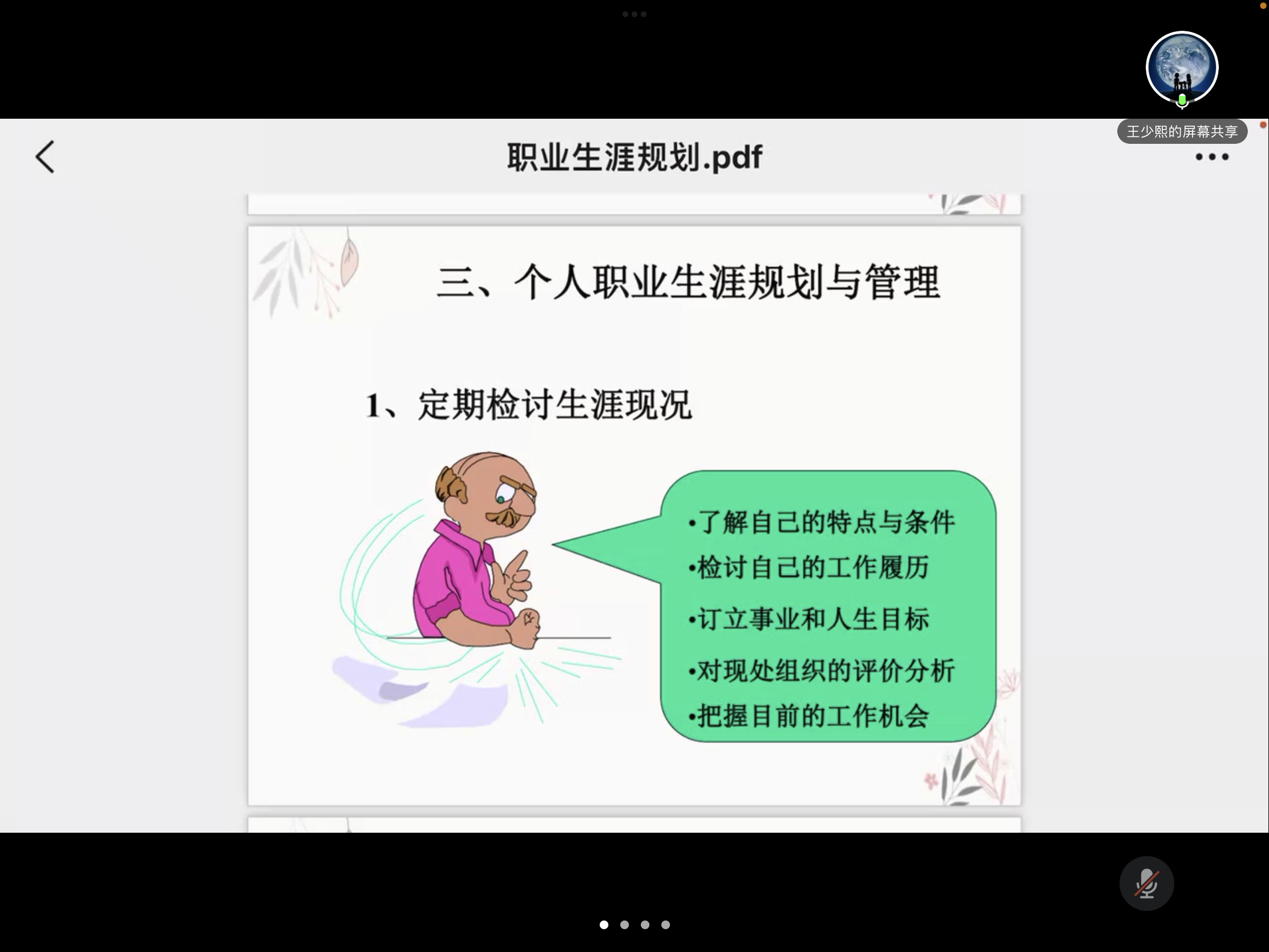 毕业,期待毕业生们在不久的将来能够成为有用之才,为社会主义现代化建设作出卓越的贡献。随后,王老师用他几十年的工作经验与人生阅历,在课上游刃有余地诠释出了职业发展教育的各个观点。王老师突出强调了个人职业生涯规划与管理需要做到定期检讨生涯现况、进行职业生涯相关训练、善于咨询,兼听则明与跨业学习,把握先机。王老师的讲解深入浅出,既为大四年级即将毕业的同学指明了职业发展的方向与方法,也给其他年级的同学带来了职业发展规划的教育与启示。