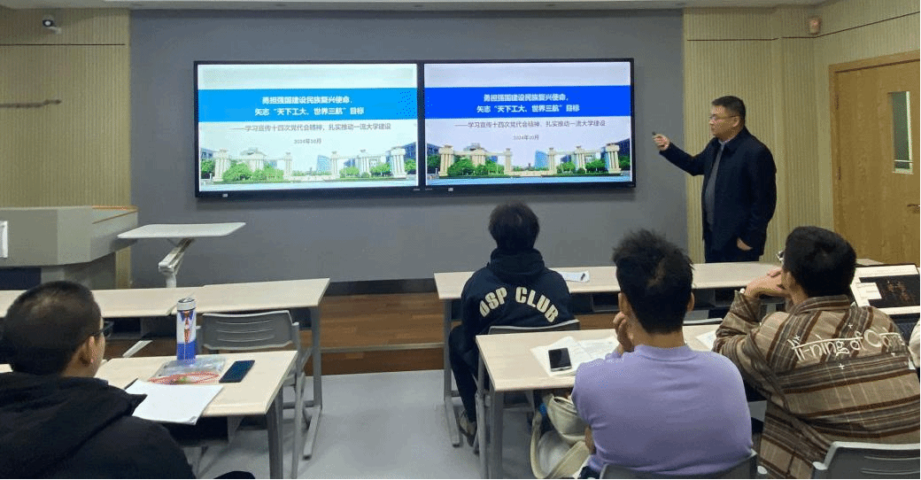 马炳和带领大家学习党的二十届三中全会和全国教育大会精神,分析了高校作为科技创新的前沿阵地,应当深化教育综合改革,加强一流大学和优势学科建设,适应新时代的发展需求。马炳和介绍了学校第十四次党代会的召开背景与会议主题,回顾了学校五年来主要成绩,讲解了“天下工大,世界三航”远景目标的内涵、新“三步走”战略构想。从“总师型”拔尖创新人才自主培养、高素质创新型人才队伍、一流学科发展生态、高水平国家战略科技力量、全球合作新格局等角度阐释了重点任务。课程最后,马炳和呼吁发展对象准确把握党代会精神,奋发有为,顽强拼搏,努力成为“专业精、系统强、重实践、能担当”的青年科技创新人才。