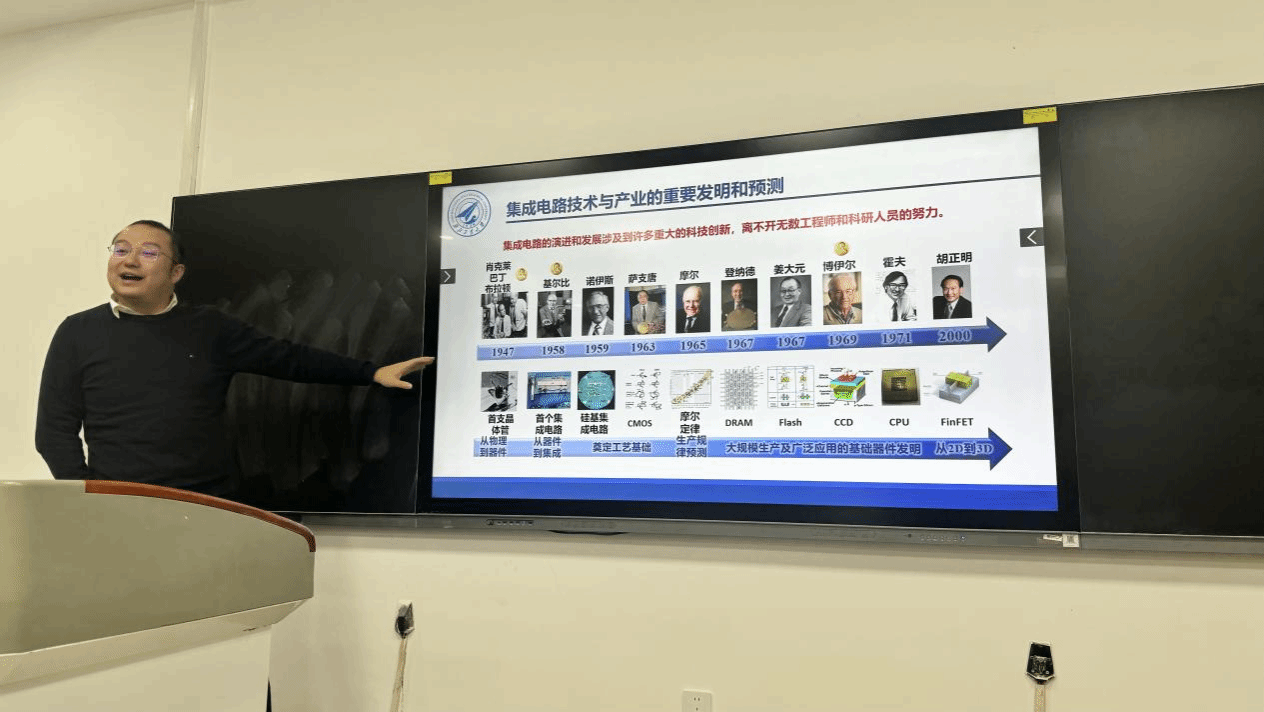 课上,阴玥带领大家开启了对集成电路世界的深度探索之旅。在“无处不在的集成电路芯片”部分,他以生动的语言和丰富的案例,揭示了芯片在现代社会的重要地位。通过展示一系列芯片应用实例的图片,让同学们深刻感受到集成电路芯片如同现代社会的神经系统,默默支撑着各个领域的高效运转。立足集成电路技术发展的关键节点,基于当前技术发展趋势,对未来集成电路技术的发展方向进行了科学预测,激发了大家在科研道路上勇于探索未知领域的决心。