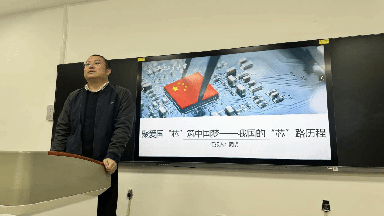 副院长阴玥为学院入党积极分子讲授了“聚爱国“芯”筑中国梦 —— 我国的‘芯’路历程” 的专题党课。