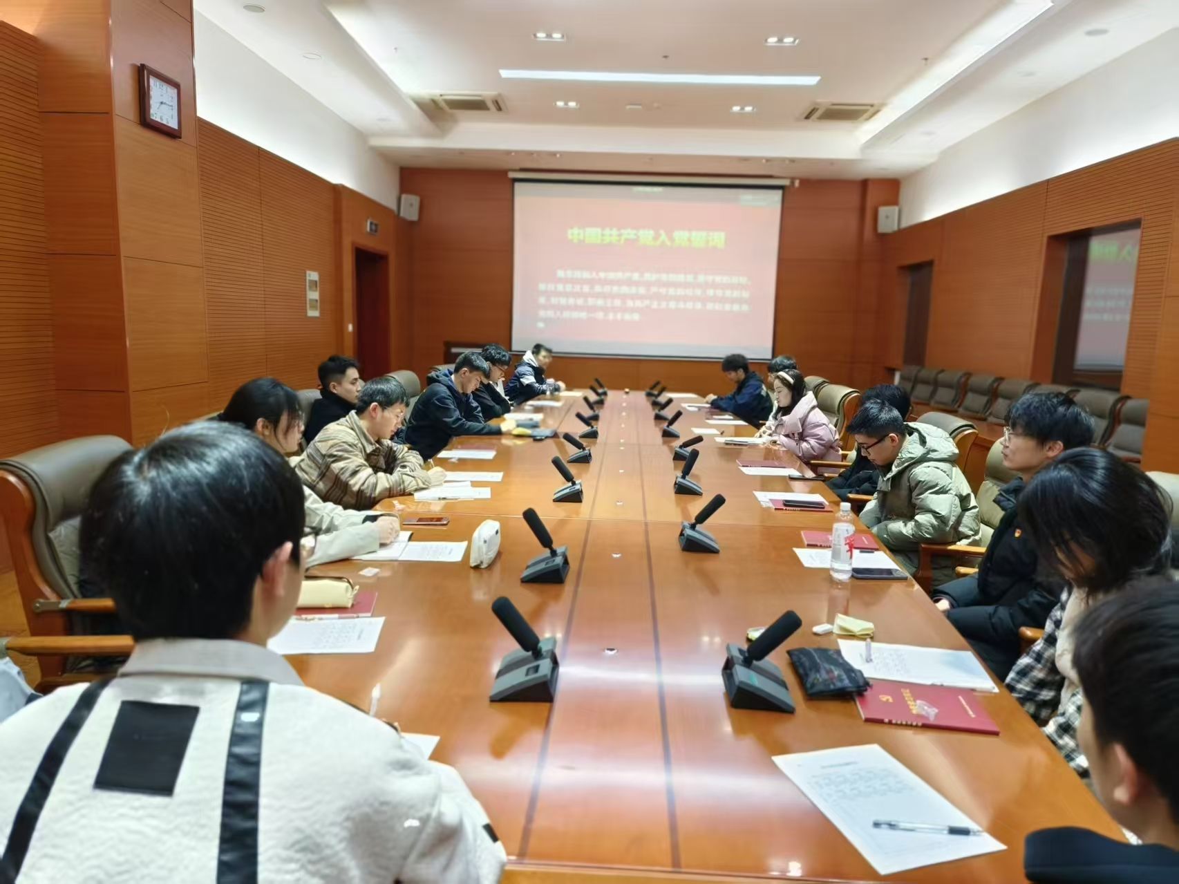 会议开始,新发展党员进行入党宣誓,其他党员重温入党誓词。全体党员紧握右拳,庄严宣誓,呼喊出对党忠诚、为党献身的光荣誓言。