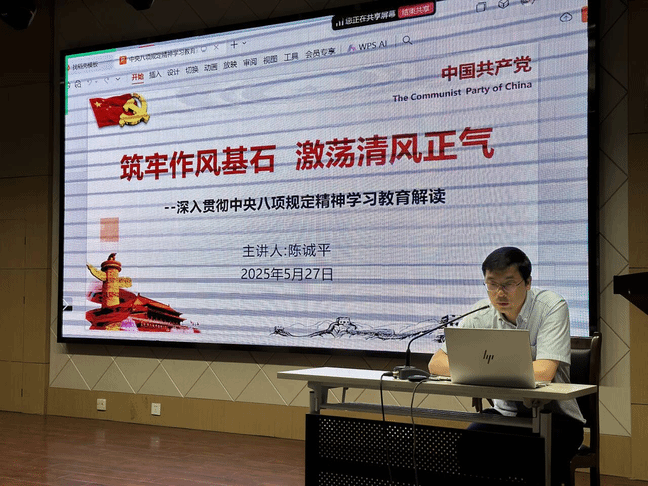 5月27日,陈诚平副教授以《牢筑作风基石,激荡清风正气》为主题,深入解读中央八项规定精神。他以“小切口推动大变革”为切入点,阐释八项规定作为党的作风建设重要抓手的战略意义,结合“三个务必”深刻内涵,强调全面从严治党对推进中国式现代化的政治保障作用。课程还围绕调查研究、社会公平等现实议题,要求学员杜绝形式主义,以务实作风践行党的宗旨。