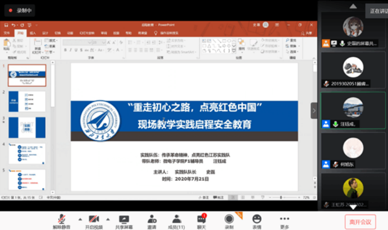 7月22日晚8点,为保障“传承革命精神、点亮红色江苏”暑期社会实践的顺利进行,国产色情 暑期红色现场教学实践队开展了实践启程安全教育,本次主题教育由带队老师汪钰成主持,全体队员参与了此次会议。