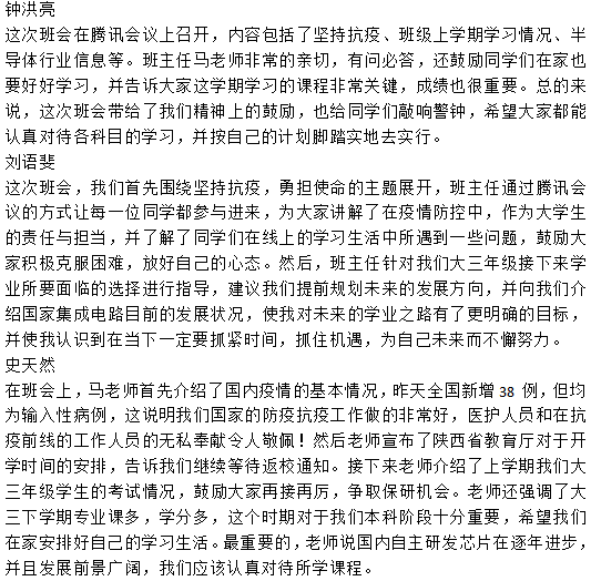 在17021701班与17021702班“坚持抗疫、勇担使命”主题班会上,班主任马彦昭老师强调当前疫情尚未解除,希望同学们坚持抗疫到底,每日能够按时填报疫情防控信息,为顺利返校做好准备。接着,马老师对上学期班级学生期末考试情况进行了总结分析,介绍了目前我国集成电路产业的发展现状,鼓励同学们在战“疫”的同时能够勇担使命,科学规划好自己的学习生活和职业生涯,树立远大目标,为我国集成电路产业的发展贡献力量。最后,同学们在线上开展热烈的讨论,纷纷发表了自己的想法与体会。