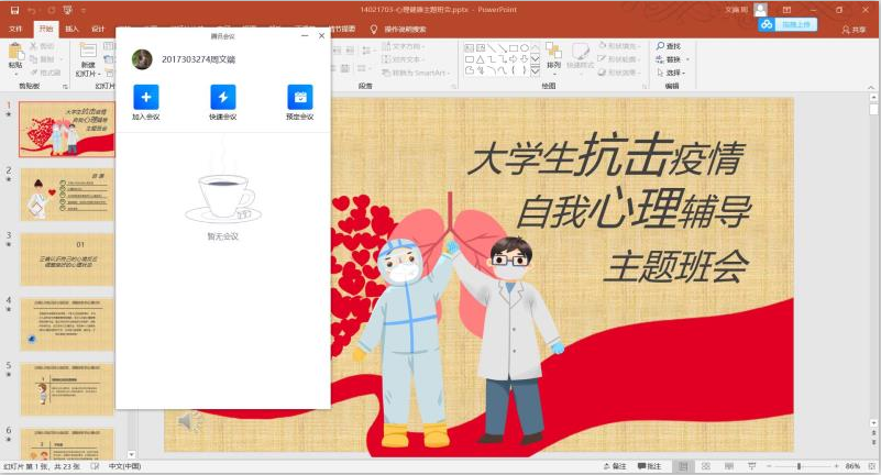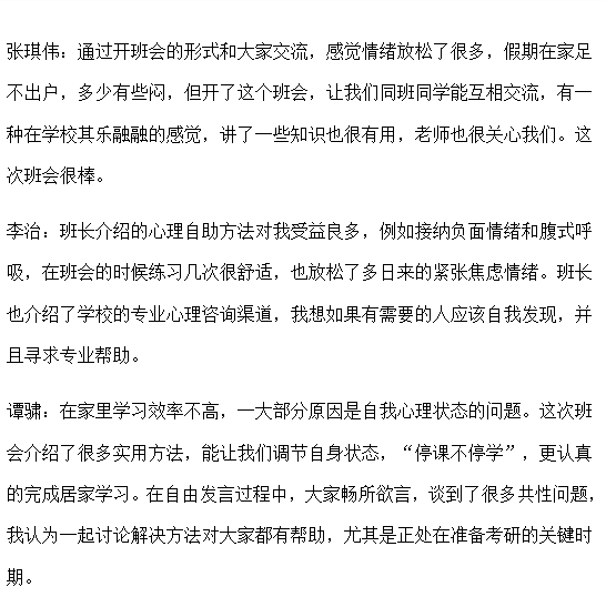 在17021703班“安心定志,你我同行”主题班会上,小班长首先通过疫情期间的心境反应介绍了心理自助的主要方法,包括接纳负面情绪、不恐慌、保证合理睡眠,腹式呼吸法等,同时对学校专业心理援助的渠道以及如何识别是否需要援助进行了详细说明,使同学们受益良多,对如何科学做好“停课不停学”、集中注意力认真学习以及如何做好心理自我防护有了更深入的了解。最后,在班主任王昆老师的组织下,大家相聚云端,依次讲述自己的居家学习生活体会,遇到有困难问题的学生,全班同学共同献计献策、共同克服困难。这场班会不仅促进了师生间的交流互动,更促进了学风班风建设,增强了班级凝聚力。