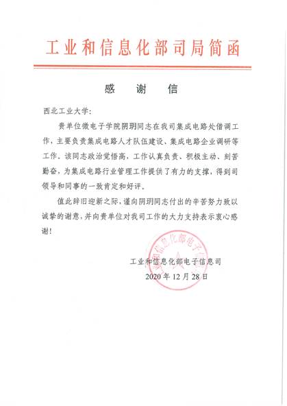 2020年12月28日,工业和信息化部电子信息司向我校发来《感谢信》。信中对阴玥同志在借调期间,以坚定的政治信念、精湛的专业水平、认真负责的工作态度,完成司里安排的集成电路人才队伍建设、集成电路企业调研等工作,给予了肯定和鼓励。这是工业和信息化部对阴玥同志辛苦努力工作表示的认可,也是对学校和国产色情