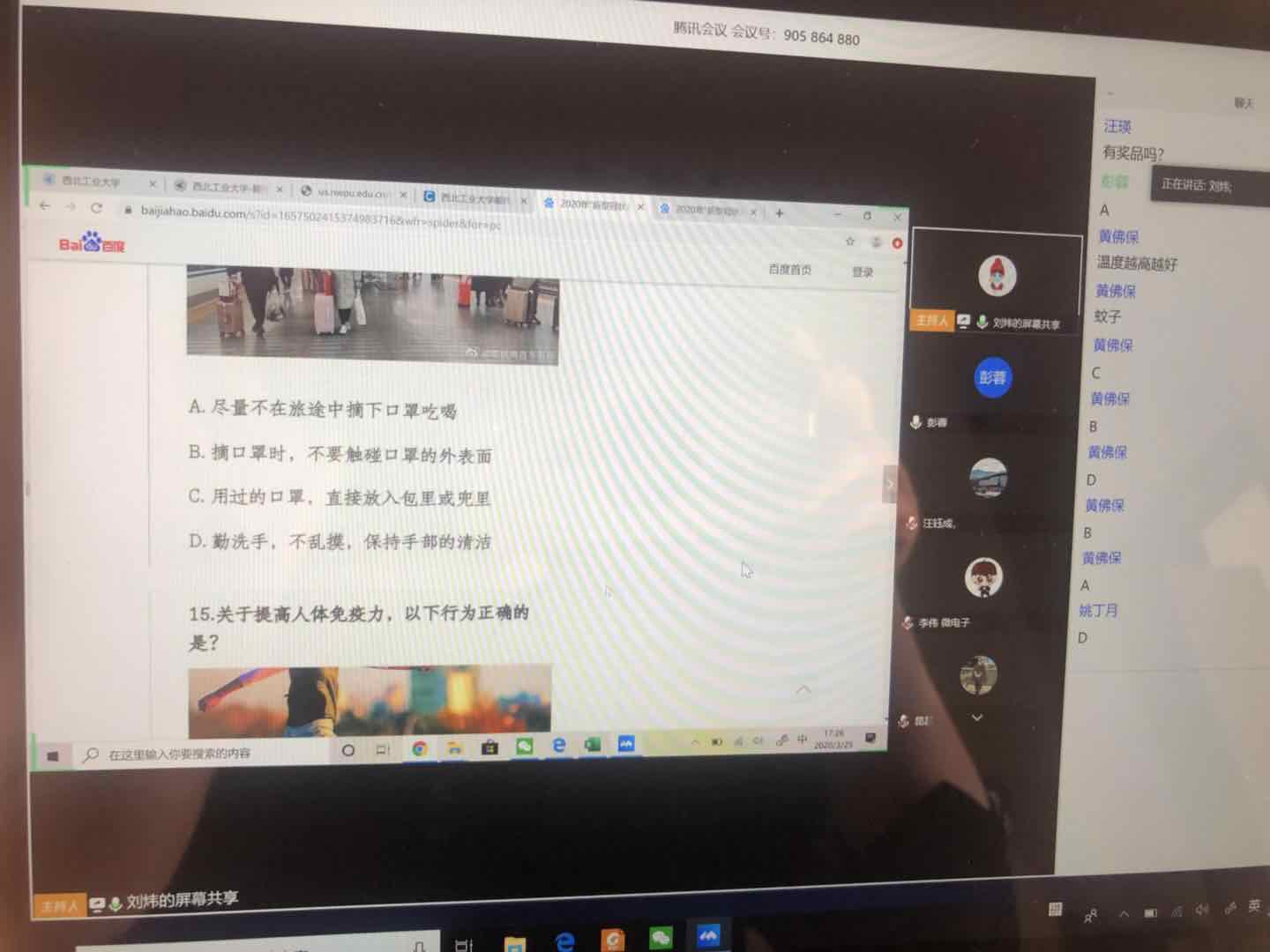 最后,支部组织全体教工党员线上开展“新型冠状病毒防治知识答题活动”,每位教工党员轮流作答,大家积极踊跃,轮流作答变成了抢答,会议在欢快的气氛中结束。通过此次疫情防控知识答题活动,支部进一步宣传了防疫防控知识,让党员教师了解了如何预防新冠肺炎保护好自己,为开学复工做好准备。