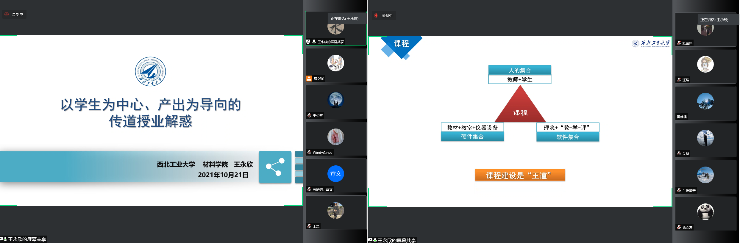 2021年10月20日星期四上午8点半,我院邀请材料学院王永欣副院长举办“课程思政与教学能力提升”专题讲座,讲座采取线上会议方式,西安校区和太仓校区全体教师参加。院长周德云、副书记(主持工作)甘雪涛等院领导全部出席讲座。讲座由副院长王少熙主持。院长周德云、副书记甘雪涛对王永欣副院长的到来表示了欢迎和感谢。