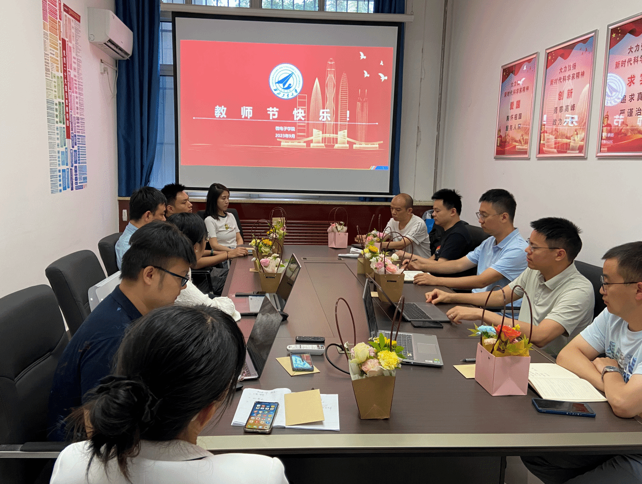 会议伊始,西安、太仓两地学生代表为老师们献上了鲜花并致以诚挚的祝福和感谢,甘雪涛向全体教师致以节日的祝福和问候。为进一步加强我院师德师风建设,深入推进师德专题教育,甘雪涛带领与会教师进一步学习了习近平总书记关于教育的重要论述,重温了《新时代高校教师职业行为十项准则》,呼吁全体教师作为教师要正确认识教书育人的岗位职责,应敬畏课堂,注重细节,认真负责地讲好每一堂课。同时,要积极探索思政元素与课堂教学有机结合的工作路径,为国家培养出有爱国情、报国志的卓越人才。在座谈交流环节,参会教师畅所欲言,分享教书育人的感悟与荣光。
